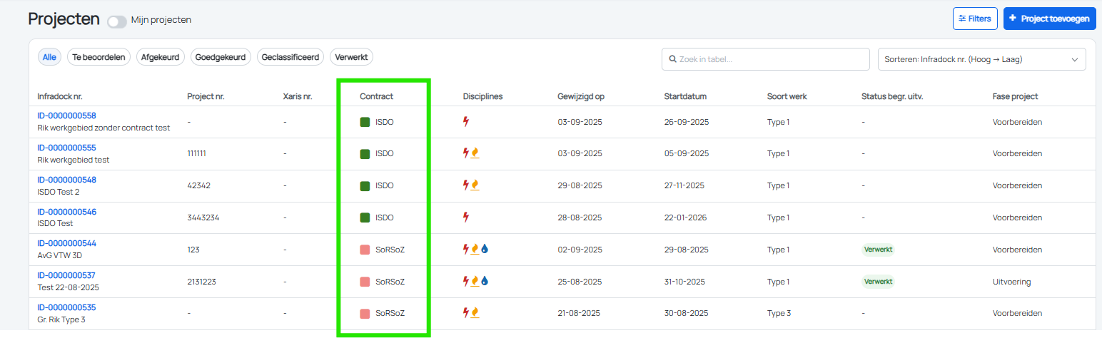 Vanaf deze release is de kolom ‘Contract’ opgenomen in het projectoverzicht indien de organisatie van de gebruiker onderdeel is van meerdere raamovereenkomsten. Elk contract krijgt zijn eigen kleur. Hierdoor krijgt een gebruiker een beter overzicht van welke projecten voor welk contract zijn.