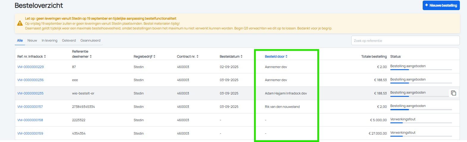 Vanaf deze release is er te zien welke gebruiker de bestelling heeft gedaan. Dit wordt getoond in het besteloverzicht.