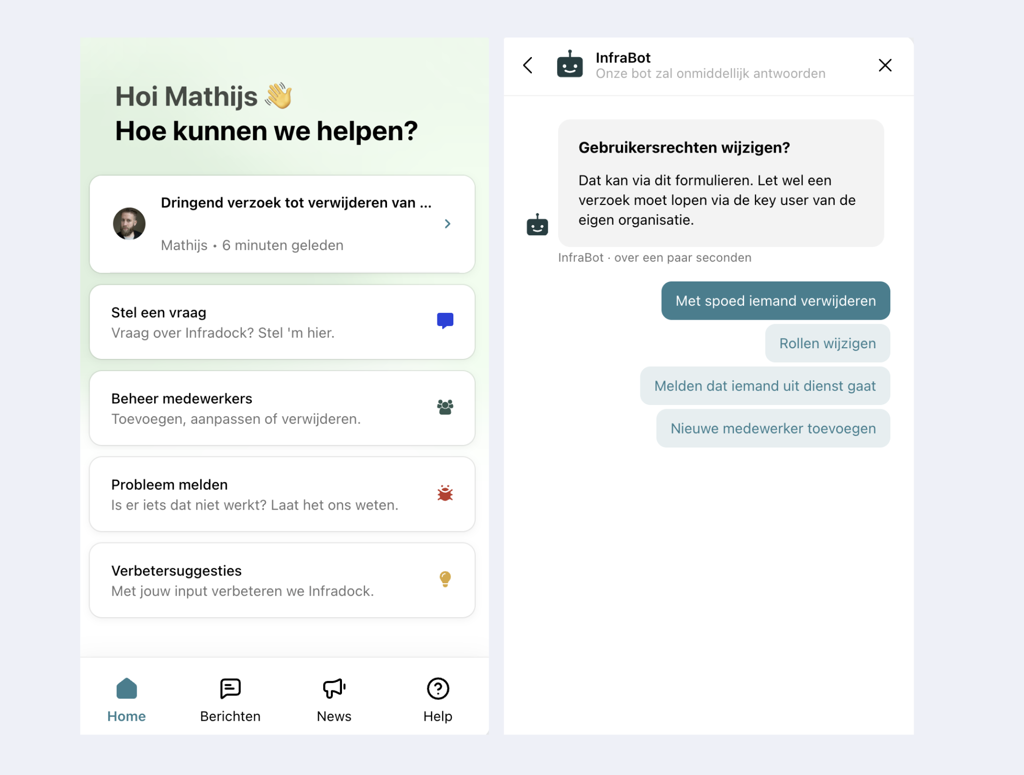 HR-verzoeken zoals medewerker verwijderen, rollen wijzigen, uitdienstmelding en nieuwe medewerker toevoegen kunnen vanaf nu rechtstreeks in Infrabot onze servicedesk chatbot worden ingediend. Deze is te vinden onder het groene lipje rechts aan de zijkant van je scherm.