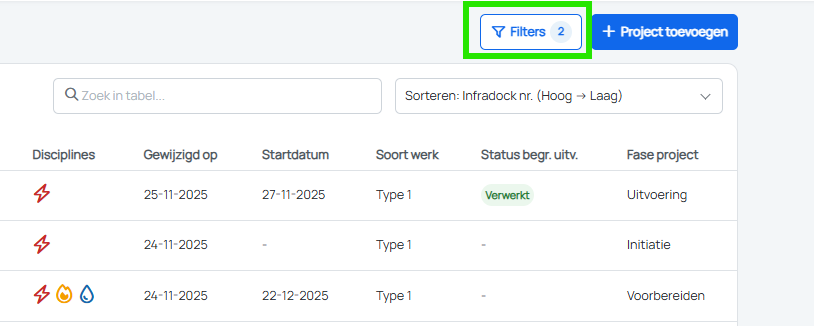 In de vorige release werden geselecteerde filters al onthouden tijdens het werken in Infradock. Nu wordt daar bovenop een teller getoond, zodat je in één oogopslag ziet hoeveel filters er actief zijn.