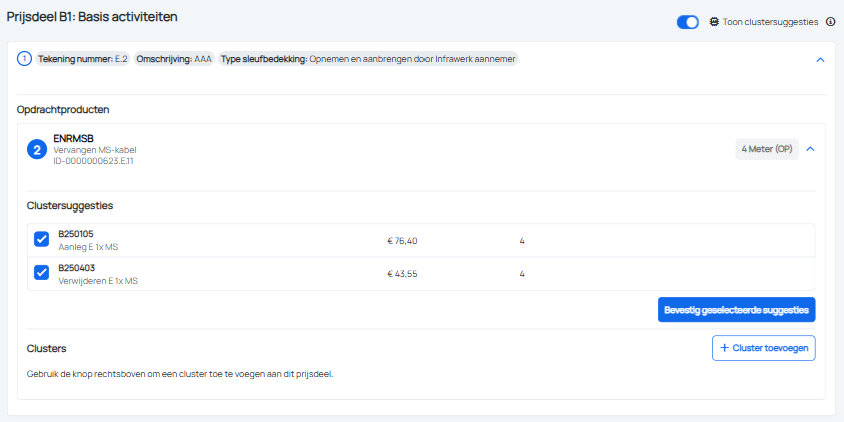 We hebben de mogelijkheid voor AI clustersuggesties voor prijsdeel B1 toegevoegd. Deze functionaliteit kan per regieorganisatie en aannemer worden aangezet. Indien de gebruiker de toggle voor clustersuggesties heeft aangezet, zullen er suggesties worden getoond per opdrachtproduct zolang er nog geen cluster onder het opdrachtproduct is toegevoegd. Op dit moment zullen deze suggesties alleen voor clusters met type Vaste prijs worden gedaan. Vervolgens kan de gebruiker (een selectie van) de voorgestelde clusters toevoegen onder het opdrachtproduct.