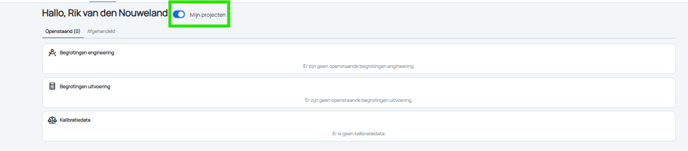 Voorheen werden op het dashboard enkel de begrotingen en kalibraties getoond van je eigen projecten. Vanaf nu is het ook mogelijk dit voor alle projecten van jouw organisatie te zien. Hierbij is er wel een waarschuwing toegevoegd dat de laadtijd iets langer kan zijn.
