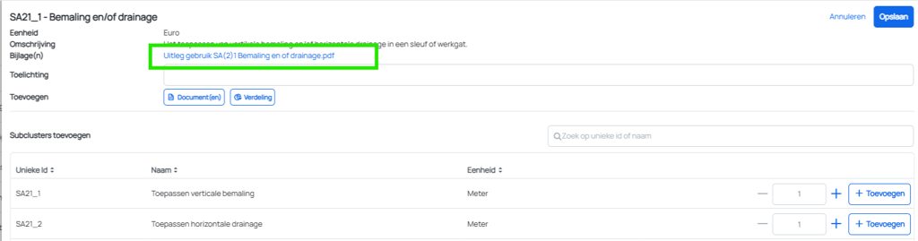 Je kan de bijlages vinden in de uitvoeringsraming / -begroting in prijsdeel B2 bij het selecteren van het cluster.