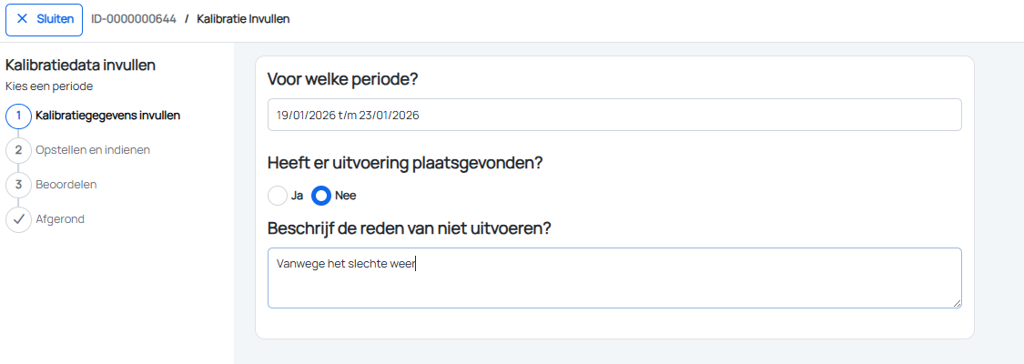 Bij het kalibratieformulier kun nu worden aangeven dat er geen uitvoering heeft plaatsgevonden. Als de gebruiker deze optie selecteert is het verplicht om een reden op te geven.