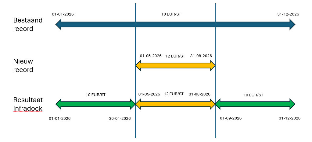 Door verschillende omstandigheden kan het voorkomen dat een materiaal of dienst voor een bepaalde periode een andere prijs krijgt. Deze nieuwe prijs met een afgebakende periode kan nu worden toegevoegd zonder dat dit lijdt tot problemen. Bestaande prijzen worden netjes opgeknipt of ingekort om plaats te maken voor de nieuwe prijs.