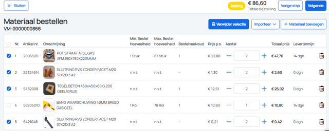 Het is nu mogelijk om meerdere materialen tegelijk te selecteren en te verwijderen. Dit kun je doen door de materialen aan te vinken per regel of in één keer alles te selecteren via de alles selecteren checkbox en vervolgens te bevestigen.