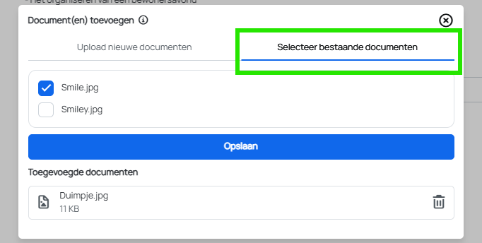 Ga in de uitvoeringsraming en -begroting naar een cluster en open de documenten pop-up. Via het nieuwe tabblad 'Selecteer bestaande documenten' selecteer je eenvoudig de gewenste documenten.